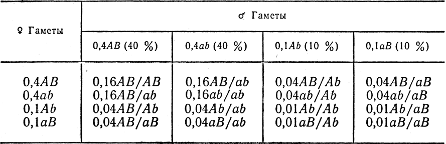 Составив решетку Пеннета с учетом частоты гамет каждого типа, можно подсчитать расщепление в F2 (табл. 5).