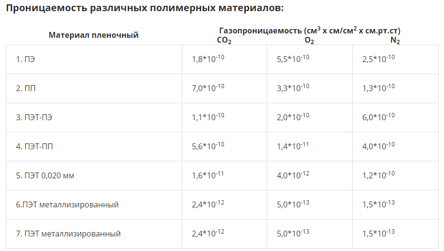 Следует отметить, что упаковочная пленка для фруктов и овощей никогда не бывает совершенно непроницаемой для кислорода, углекислого газа и водяных паров. Это приводит к некоторым дополнительным сложностям в процессе хранения. Даже если используется достаточно плотная упаковочная пленка, то углекислый газ все равно будет проникать через нее извне, что приведет к изменению атмосферы упаковки и сокращению срока хранения плодов. Скорость его проникновения зависит от типа пластика, толщины пленки и ее площади, перепадов температур и давлений газов на каждой стороне пленки (внутри и снаружи).