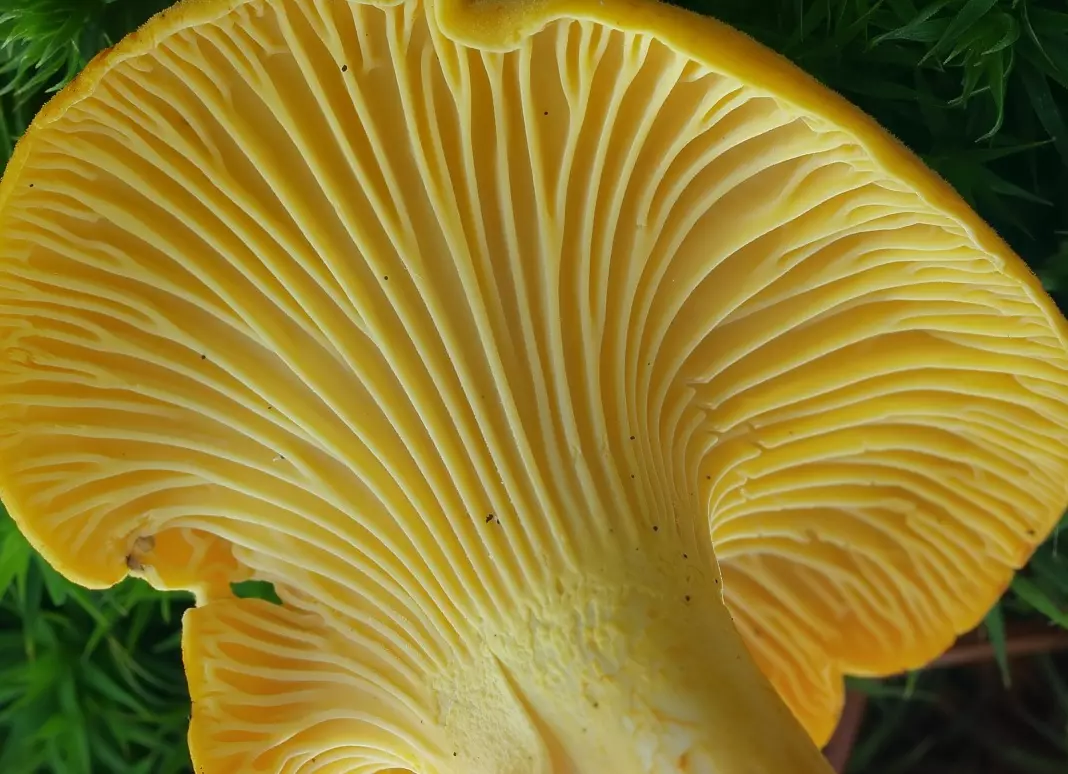 Пластинки гименофора у лисички окрашены в общий тон плодового тела и далеко спускаются на ножку.