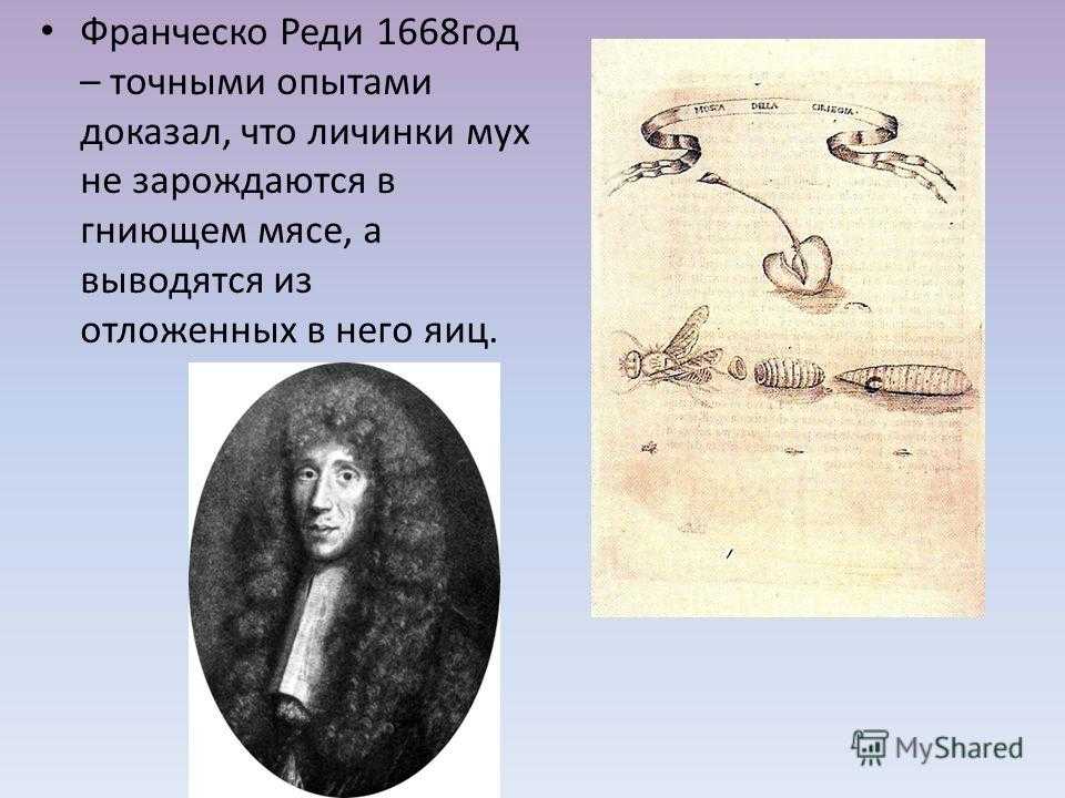 Франческо Реди 1668 год – точными опытами доказал, что личинки мух не зарождаются в гниющем мясе, а выводятся из отложенных в него яиц.