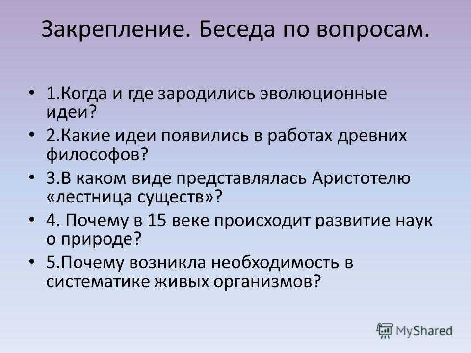 Закрепление. Беседа по вопросам. 1. Когда и где зародились эволюционные идеи? 2. Какие идеи появились в работах древних философов? 3. В каком виде представлялась Аристотелю «лестница существ»? 4. Почему в 15 веке происходит развитие наук о природе? 5. Почему возникла необходимость в систематике живых организмов?