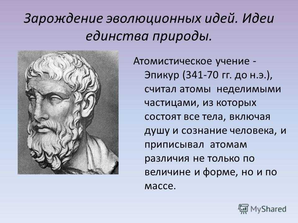 Зарождение эволюционных идей. Идеи единства природы. Атомистическое учение — Эпикур ( гг. до н.э.), считал атомы неделимыми частицами, из которых состоят все тела, включая душу и сознание человека, и приписывал атомам различия не только по величине и форме, но и по массе.