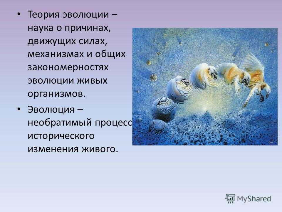 Теория эволюции – наука о причинах, движущих силах, механизмах и общих закономерностях эволюции живых организмов. Эволюция – необратимый процесс исторического изменения живого.