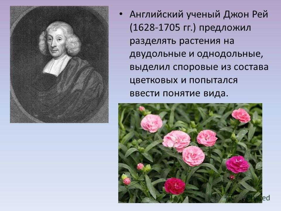 Английский ученый Джон Рей ( гг.) предложил разделять растения на двудольные и однодольные, выделил споровые из состава цветковых и попытался ввести понятие вида.