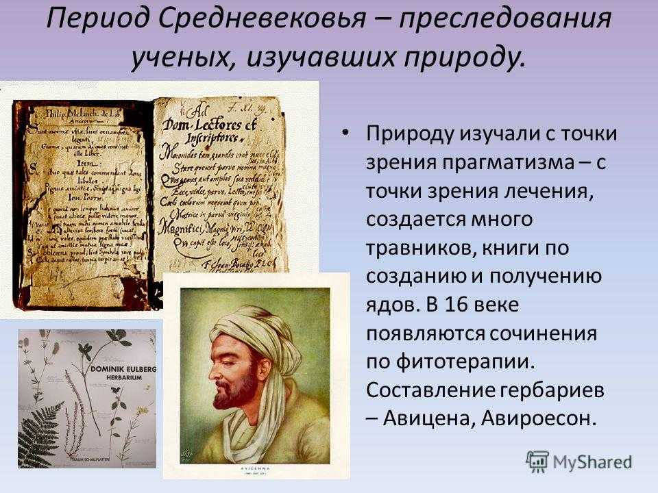 Период Средневековья – преследования ученых, изучавших природу. Природу изучали с точки зрения прагматизма – с точки зрения лечения, создается много травников, книги по созданию и получению ядов. В 16 веке появляются сочинения по фитотерапии. Составление гербариев – Авицена, Авироесон.