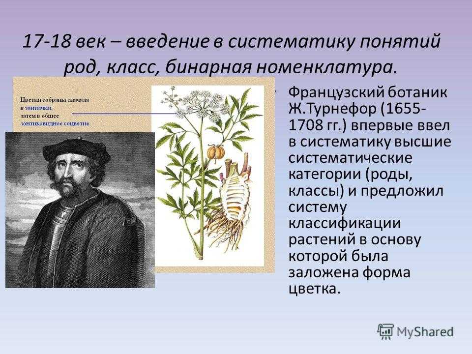 17-18 век – введение в систематику понятий род, класс, бинарная номенклатура. Французский ботаник Ж.Турнефор ( гг.) впервые ввел в систематику высшие систематические категории (роды, классы) и предложил систему классификации растений в основу которой была заложена форма цветка.