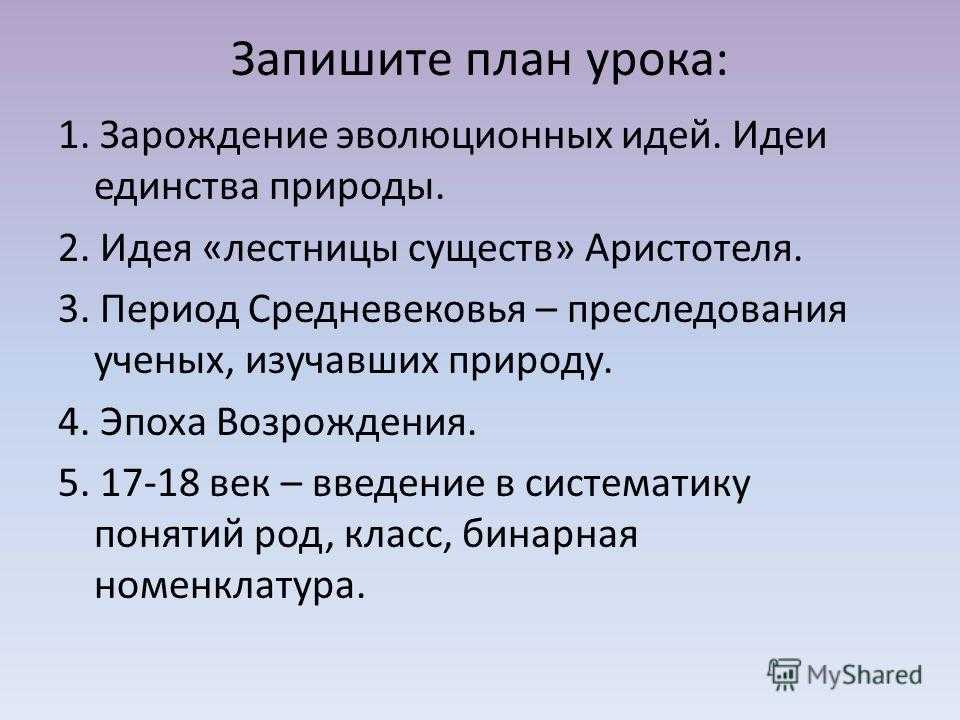 Запишите план урока: 1. Зарождение эволюционных идей. Идеи единства природы. 2. Идея «лестницы существ» Аристотеля. 3. Период Средневековья – преследования ученых, изучавших природу. 4. Эпоха Возрождения век – введение в систематику понятий род, класс, бинарная номенклатура.