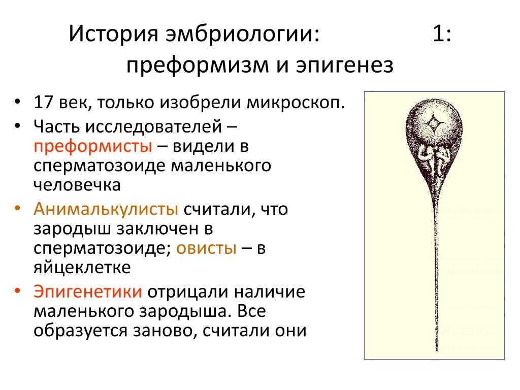приглашение Петербургской АН и в 1768 представил научной общественности труд «Об образовании кишечника у цыплёнка», в котором окончательно установил принцип эмбрионального развития органов из листовидных слоёв, заложив таким образом первые основы учения о зародышевых листках (цит. по Л.Я. Бляхер. История эмбриологии в России. М., 1955 http://www.cultinfo.ru/fulltext/1/001/008/126/450.htm). В России Вольф руководил Анатомическим кабинетом Кунсткамеры, и подготавливал труд, посвящённый «теории уродов». Внезапная смерть помешала осуществить эти планы. Но что особенно любопытно, при всей доброкачественности работ Вольфа, его эпигенетические взгляды не были приняты … Однако пропагандисты эпигенетической идеи быстро объявились и активно взялись за ее утверждение. Блюменбах издал в 1781 году памфлет, в котором объяснявшиеся ранее в преформистском духе явления регенерации у гидры, восстановление тканей у человека при заживлении ран и явления галло-образования у растений, перетолковал на эпигенетический лад: опять-таки факты те же, а интерпретация другая. Диалектические тенденции немецкой классической философии (Кант, Фитхе, Шеллинг, Гегель) открыли теории эпигенеза зеленый свет. Влияние идей Вольфа сказалось в эмбриологических исследованиях Л. Тредерна, Х.И. Пандера и Карла-Эрнеста (Карла Максимовича) Бэра (1792-1876). Бэр открыл и описал в 1827 яйцо в яичнике млекопитающих.