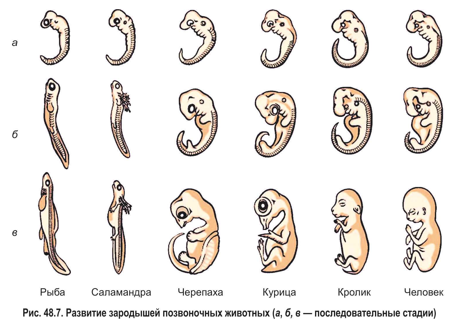 Впервые эту закономерность обнаружил российский эмбриолог К. Бэр в начале XIX в. Детально исследовав зародышевое развитие позвоночных животных, принадлежащих к разным классам, он выяснил, что на ранних этапах онтогенеза зародыши различных организмов развиваются сходно и лишь на более поздних стадиях между ними появляются различия (рис. 48.7). Это обобщение впоследствии было названо законом зародышевого сходства. Сходство развития эмбрионов различных животных, наблюдаемое на ранних стадиях, свидетельствует об общности их происхождения. Возникающие впоследствии отличия указывают на дивергенцию, которая осуществлялась в ходе эволюции и привела к появлению различных систематических групп.