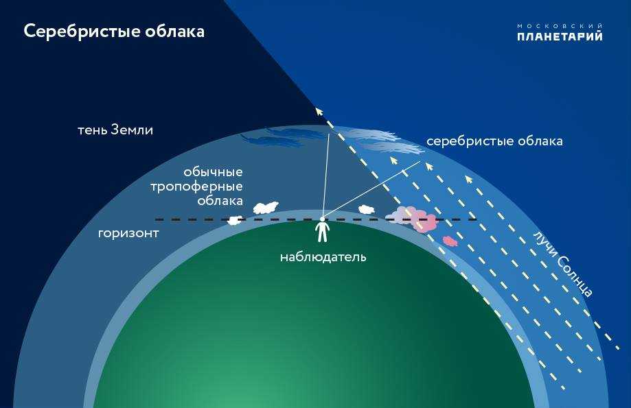 Серебристые облака образуются в верхних слоях атмосферы, на высотах 80-90 км и освещаются Солнцем, неглубоко опустившимся под горизонт (поэтому в Северном полушарии они наблюдаются в северной части неба, а в Южном полушарии – в южной). Для их образования необходимо сочетание трёх факторов: достаточное количество водяного пара; очень низкая температура; наличие мельчайших пылевых частиц, на которых конденсируются пары воды, превращаясь в кристаллики льда.