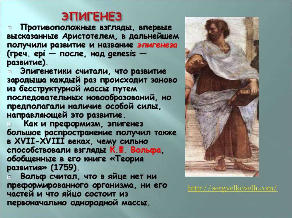 Впервые Э. был провозглашен Аристотелем в связи с критикой им преформистских взглядов атомистов о гомеомериях и Гиппократа – о пангенезе. Согласно Аристотелю, части зародыша не заложены в невидимо малых размерах в «семенах вещей» и не возникают все одновременно, а растут и развиваются в определ. последовательности. Это положение дополнялось виталистич. взглядом на то, что материя материнского зачатка приобретает форму будущего организма под влиянием нематериальных сил, «энтелехий», заложенных в семени самца.