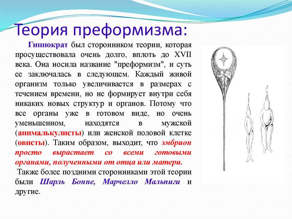 Преформизм и эпигенезВопросами зарождения и развития человека и животных интересовались еще с давних времен. Однако вплоть до XVIII существовали две противоположные точки зрения на причины и движущие силы индивидуального развития организмов.На протяжении долгого времени господствовала теория преформации, или теория предсуществования (от лат. praeformo – «заранее образую», «предобразую»).Такие сторонники теории преформизма, как Галлер, Бонна и Спалланцани, исходили из того, что все формы, структуры и свойства будущего организма заложены в нем еще до рождения. По этой теории будущий организм предсуществует в яйце уже вполне сформировавшийся, со всеми своими частями, но эти части в ранних стадиях настолько малы и прозрачны, что не видны даже в микроскоп.