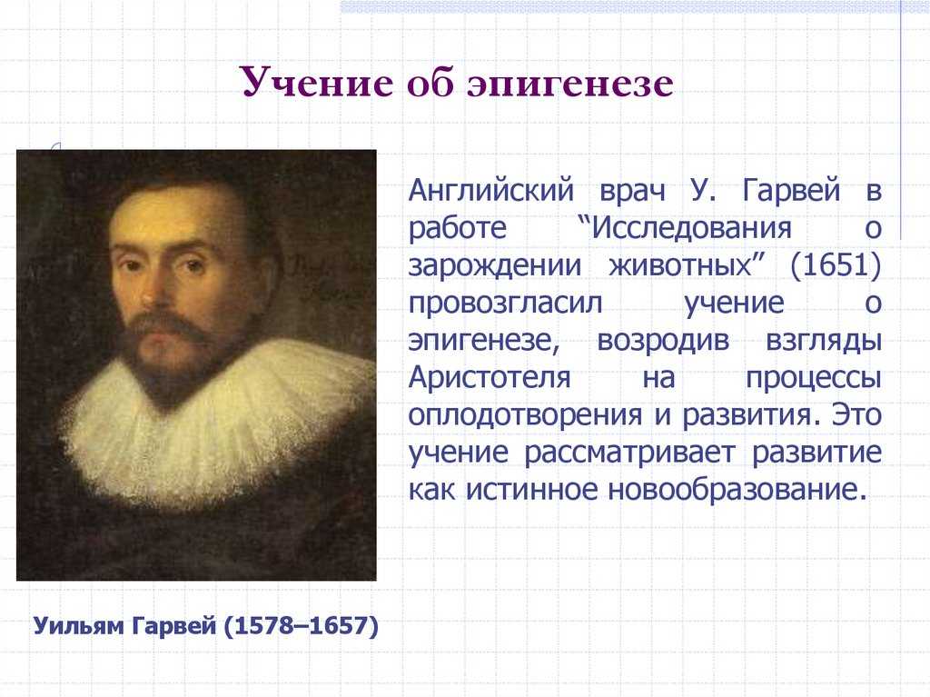 Виталистич. эпигенез Аристотеля в новое время был обоснован У. Гарвеем (1651), предложившим и термин «Э.». Гарвей выдвинул принцип «все из яйца», причем для животных, у к-рых ему не удалось обнаружить яиц, он допускал зарождение из «разлагающихся веществ».