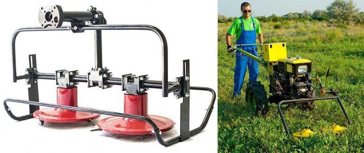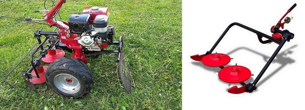 - Дисково-роторные устройства к мотоблоку. Предназначены для кошения луговой травы на очищенных от кустарников территориях. Система снабжена двумя дисками с плавающими ножами, которые вращаются друг другу навстречу. При возникновении препятствий, ножи прячутся. В результате могут оставаться участки, которые необходимо будет обработать вручную. Скошенная трава укладывается в валки посредством боковых валиков.