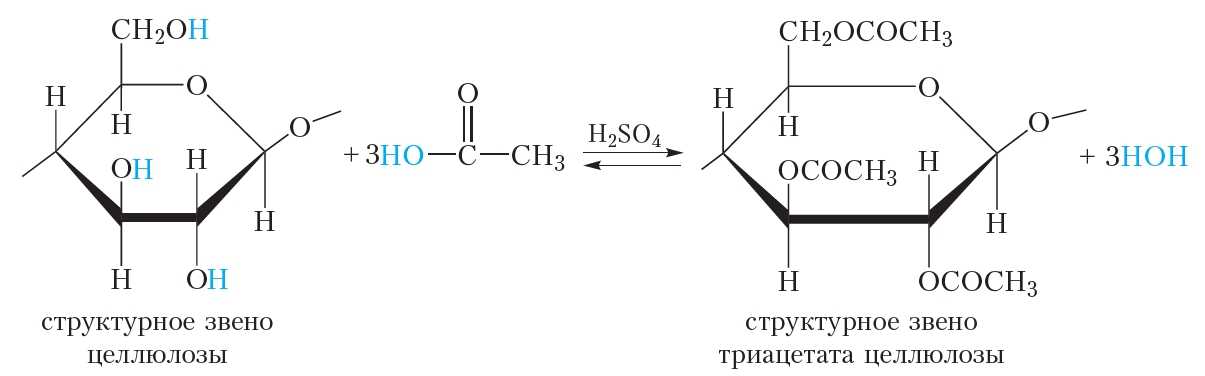 Эфиры целлюлозы с уксусной кислотой называются ацетатами целлюлозы. Если в реакцию вступают все гидроксильные группы молекулы целлюлозы, образуется триацетат целлюлозы. Из схемы видно, что в макромолекулах триацетата целлюлозы отсутствуют гидроксильные группы. Следовательно, между этими молекулами нет водородных связей, поэтому макромолекулы триацетата целлюлозы не так прочно связаны друг с другом, как молекулы целлюлозы. Это приводит к тому, что, в отличие от целлюлозы, её ацетаты растворяются в некоторых органических растворителях. Это используется при получении искусственных волокон.