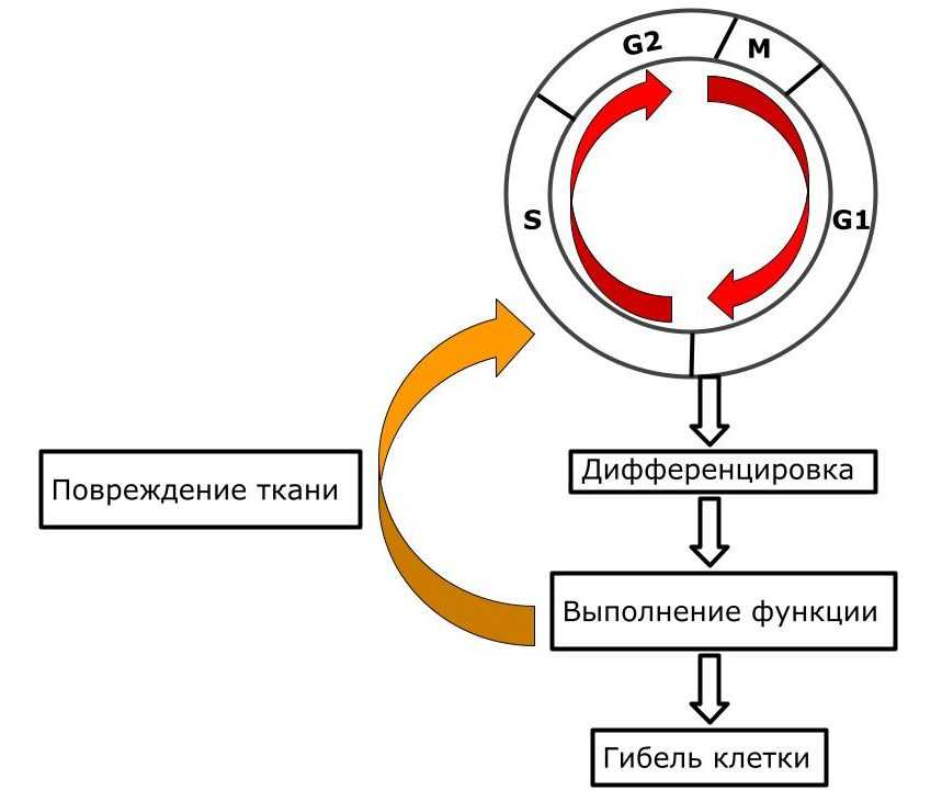 Клетка образовалась, восстановила свои органоиды, синтезировала белки и РНК — G1 период. Дальше она дифференцируется и начинает выполнять свои функции. Клетка сохранила способность к делению, но есть один нюанс. Клетка может вступить в митотический цикл при определенном условии — чаще всего при повреждении. Эти клетки обеспечивают регенерацию тканей и органов в случае их травмы. Такие клетки: