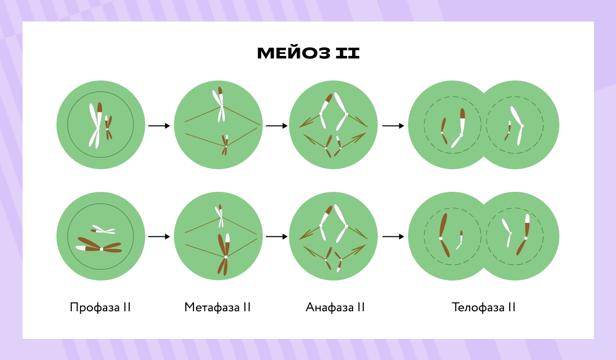 Во время мейоза одна клетка с 46 хромосомами делится дважды. Первое деление называется мейоз I, второе деление называется мейоз II. Интерфаза между двумя этапами деления мейоза настолько кратковременна, что практически незаметна, и в ней не происходит удвоение ДНК. В результате образуются четыре дочерние клетки, каждая с 23 хромосомами.