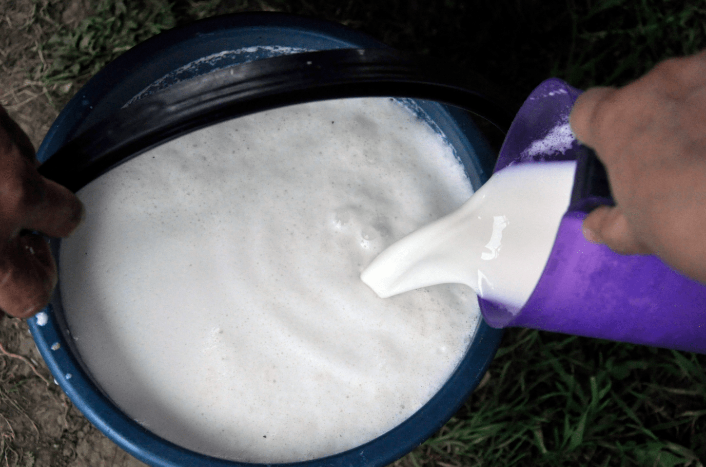 После нужно позаботиться о подготовке емкости. Она должна иметь цилиндрическую форму и сужаться в верхней части. Вверху диаметр емкости должен быть 30 см. Оптимальная высота – 1 м. Емкость должна накрываться крышкой, по центру которой есть отверстие. В него будет вставляться сбивалка, представляющая собой шест с крестовиной или диском с отверстиями. В небольшой объем кумыса для закваски вливается свежее молоко. После вся смесь взбалтывается каждый день по несколько часов.