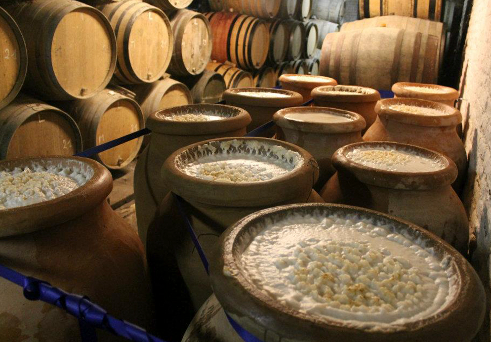 Сначала несколько суток при сложном температурном режиме готовится закваска. Затем её выливают в свеженадоенное молоко, которое находится в длинных липовых бочонках-чалках, а механические мешалки начинают их размешивать.