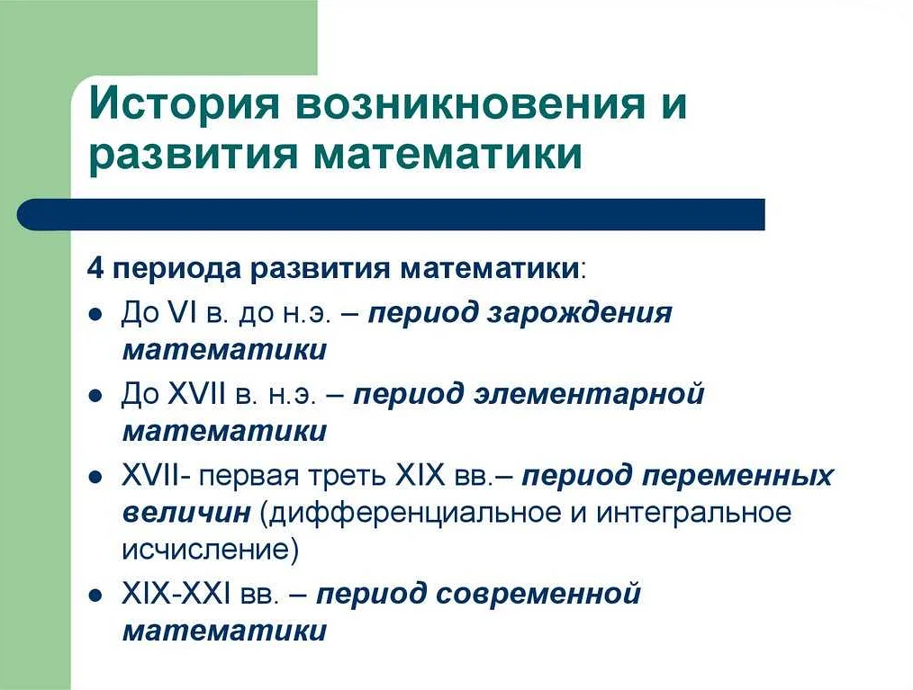 Развитие математики в истории можно выделить на несколько основных этапов. Первый этап — древнейшая математика, которая начала развиваться у сумеречных народов. Второй этап — античная математика, которая развивалась в Древней Греции и Древнем Риме. Третий этап — средневековая математика, которая была связана с развитием арабской науки и влиянием арабских математиков на Европу. Четвертый этап — новая математика, которая начала развиваться с XVI века и связана с развитием алгебры, геометрии и математического анализа. Пятый этап — современная математика, которая продолжает развиваться и включает в себя различные области и направления, такие как теория чисел, математическая логика, теория вероятностей и др.