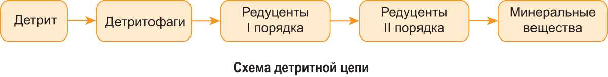 Детритные цепи (цепи разложения) — пищевые цепи, которые начинаются с отмерших органических остатков (детрита), включают детритофагов и редуцентов и заканчиваются образованием минеральных веществ. В детритных цепях происходит перенос вещества и энергии детрита между детритофагами и редуцентами через продукты их жизнедеятельности. В общем виде детритную цепь можно показать следующей схемой.