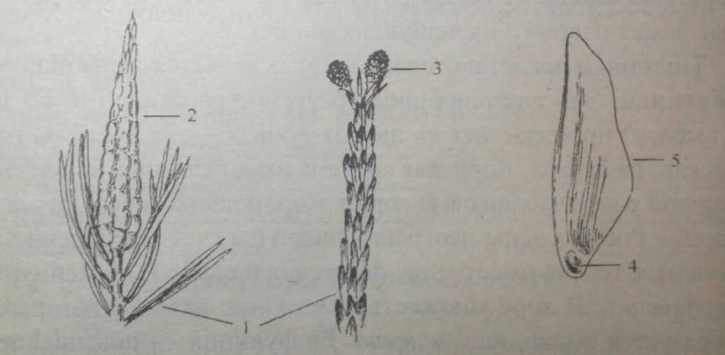 Схема строения шишек сосны: 1 — побег; 2 — пыльники; 3 — шишка с семяпочками; 4 — семя; 5 — крылышко.