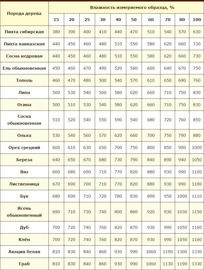 Таблица плотности дерева различной влажности (кг/м3)