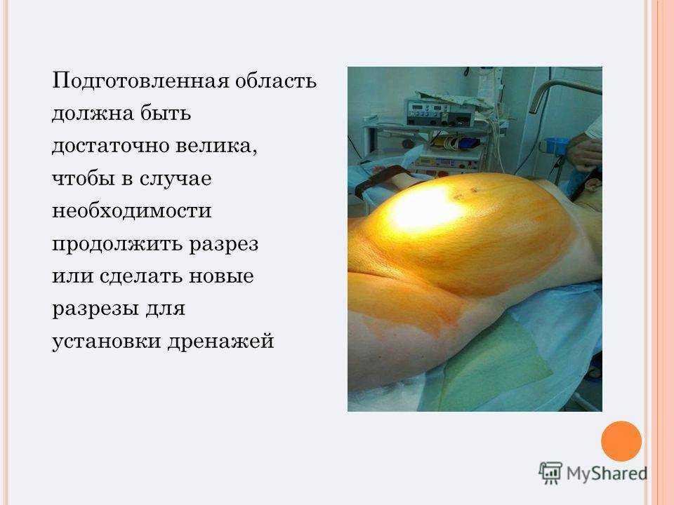 - Обработка кожного покрова. Непосредственно перед началом операции производится обработка кожи пациента дезинфицирующим раствором. Это позволяет уничтожить микроорганизмы на коже и предотвратить их попадание в рану.