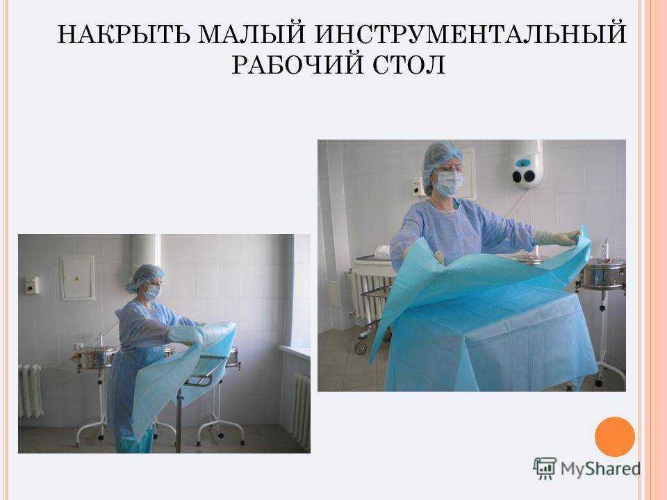 Перед тем как начнется обработка операционного поля, хирургическая сестра должна вымыть руки согласно правилам асептики и антисептики, надеть стерильное белье и перенести на операционный столик весь необходимый инструментарий.