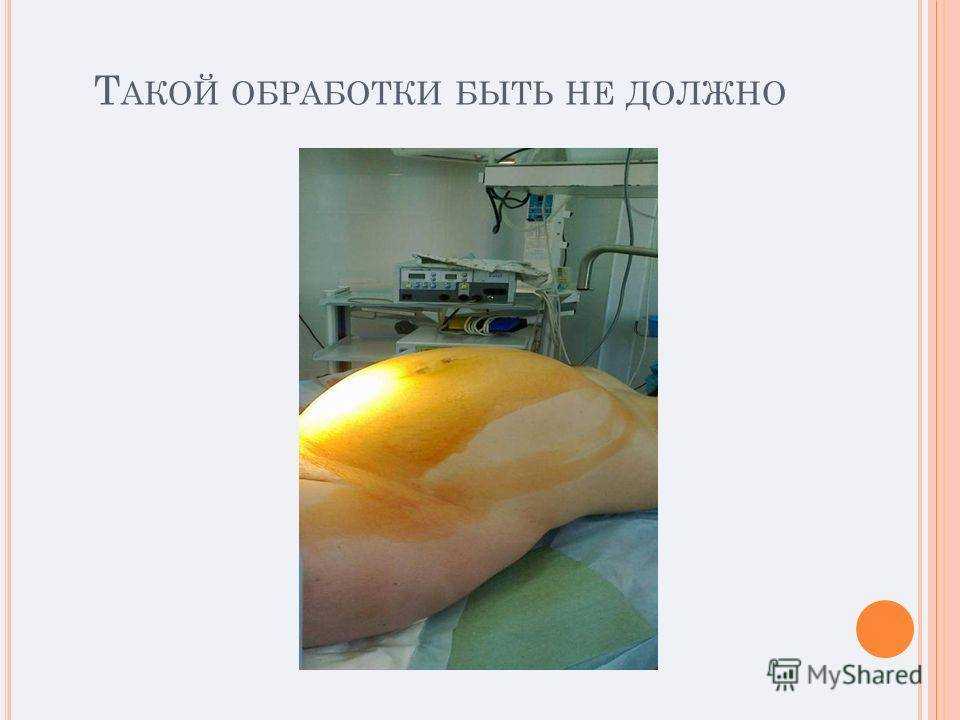 Во время обработки следует обращать внимания на то, чтобы не было затеков в паховой области у пациента. Пассивный электрод по технике безопасности должен оставаться сухим. При обработки операционного поля операционная сестра оценивает состояние кожных покровов на предмет микротравм.