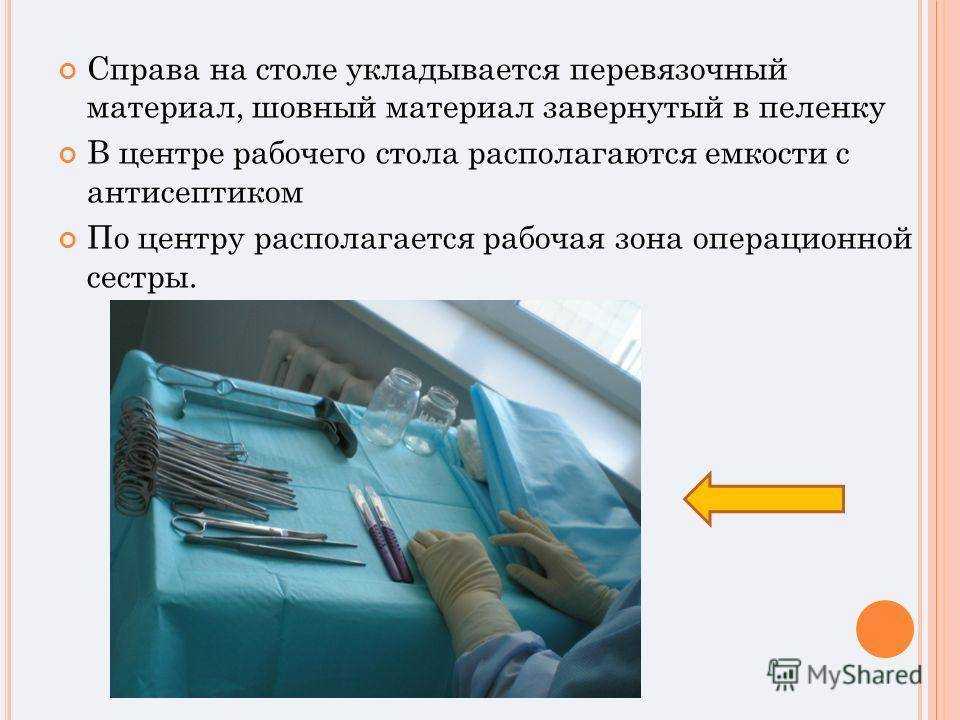 Справа на столе укладывается перевязочный материал, шовный материал завернутый в пеленку В центре рабочего стола располагаются емкости с антисептиком По центру располагается рабочая зона операционной сестры.