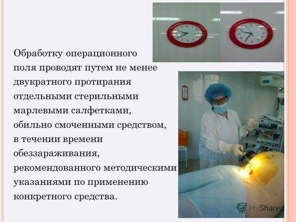 Обработку операционного поля проводят путем не менее двукратного протирания отдельными стерильными марлевыми салфетками, обильно смоченными средством, в течении времени обеззараживания, рекомендованного методическими указаниями по применению конкретного средства.