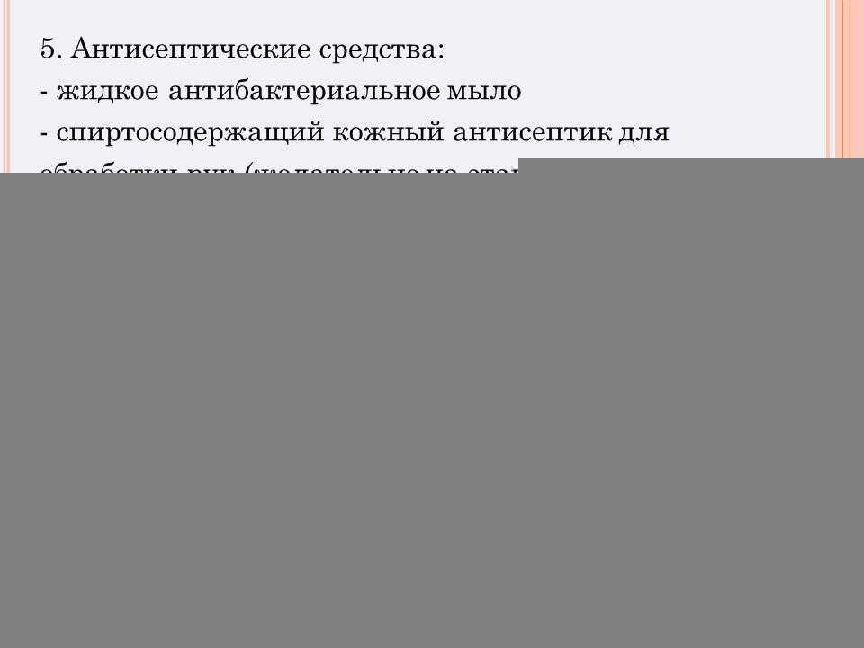 5. Антисептические средства: – жидкое антибактериальное мыло – спиртосодержащий кожный антисептик для обработки рук (желательно на этаноле так, как это сокращает время обработки) – спиртосодержащий кожный антисептик с красителем для обработки операционного поля