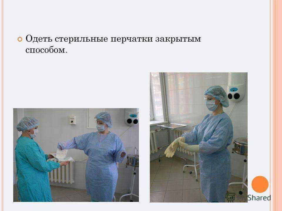 - Тщательная обработка рук и предплечий хирургической бригады. Врачи и медсестры должны провести дезинфекцию рук и надеть стерильные перчатки и манжеты.