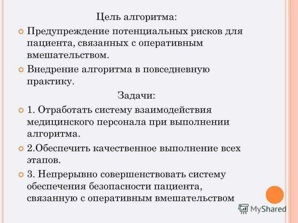 Цель алгоритма: Предупреждение потенциальных рисков для пациента, связанных с оперативным вмешательством. Внедрение алгоритма в повседневную практику. Задачи: 1. Отработать систему взаимодействия медицинского персонала при выполнении алгоритма. 2.Обеспечить качественное выполнение всех этапов. 3. Непрерывно совершенствовать систему обеспечения безопасности пациента, связанную с оперативным вмешательством