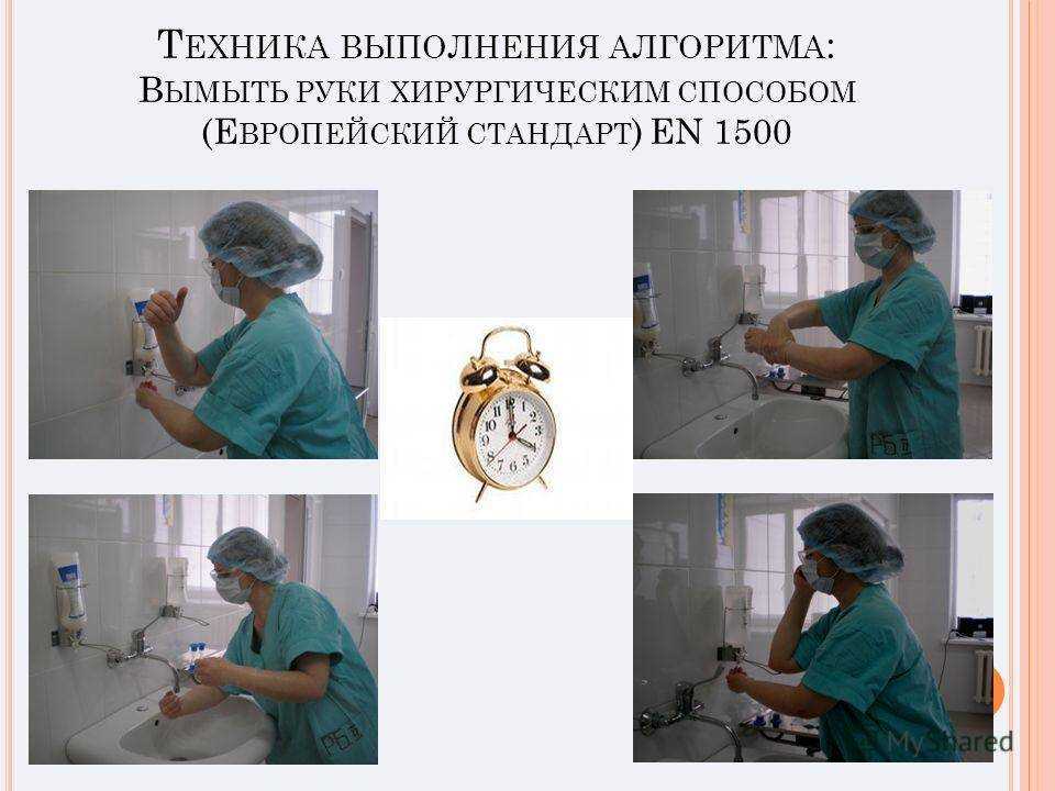Т ЕХНИКА ВЫПОЛНЕНИЯ АЛГОРИТМА : В ЫМЫТЬ РУКИ ХИРУРГИЧЕСКИМ СПОСОБОМ (Е ВРОПЕЙСКИЙ СТАНДАРТ ) EN 1500
