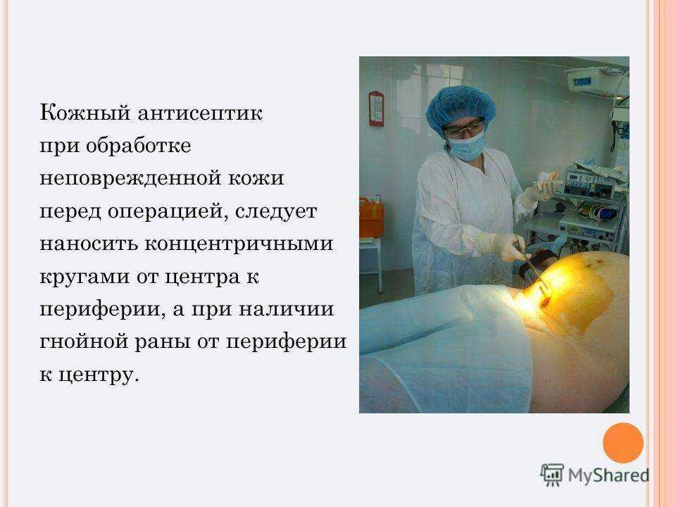 Кожный антисептик при обработке неповрежденной кожи перед операцией, следует наносить концентричными кругами от центра к периферии, а при наличии гнойной раны от периферии к центру.