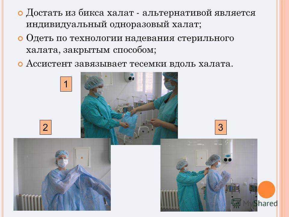 Достать из бикса халат – альтернативой является индивидуальный одноразовый халат; Одеть по технологии надевания стерильного халата, закрытым способом; Ассистент завязывает тесемки вдоль халата. 1 23