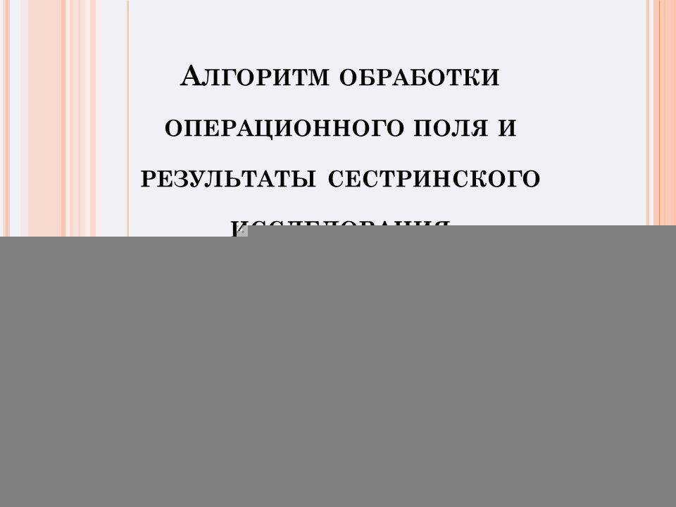 Презентация на тему: ” А ЛГОРИТМ ОБРАБОТКИ ОПЕРАЦИОННОГО ПОЛЯ И РЕЗУЛЬТАТЫ СЕСТРИНСКОГО ИССЛЕДОВАНИЯ Подготовила Старшая операционная медицинская сестра И.Б. Елфимова ГБУЗ ТО.” — Транскрипт: