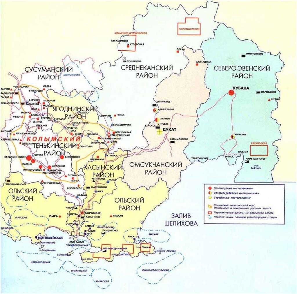 Наиболее перспективные на сегодняшний день золотые прииски региона находятся в юго-западной части области, в Тенькинском регионе. Здесь расположено месторождение Павлик, Наталкинское и Дегдекан, относящиеся к группе золото-сульфидно-вкрапленного типа. Перспективным считается и Сусуманский район, расположенный на северо-западе области. В 2017 году он выбился в тройку лидеров, заняв 2-е место.