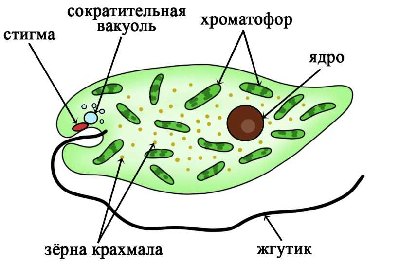 Это животное особенно тем, что на свету питается автотрофно с помощью множества мелких хроматофоров (аналог хлоропластов высших растений). Соответственно, в клетке эвглены зеленой можно обнаружить зерна крахмала. Этот организм, в отличие от многих других простейших, обладает положительным фототаксисом (плывет к свету), для ориентации использует специальный органоид ‒ глазок или стигму – скопление красного пигмента, улавливающего свет.
