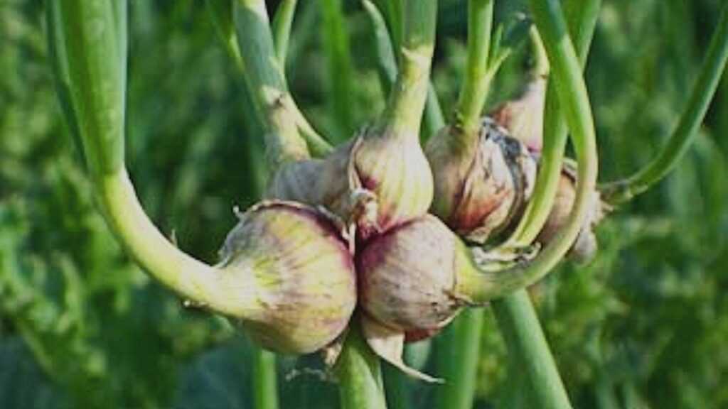 У чеснока отток пластических веществ из листьев и отмирание последних проходят не так интенсивно, как у репчатого лука. Поэтому в течение некоторого времени формирование зубков и луковиц у него идет параллельно с интенсивным нарастанием листьев.