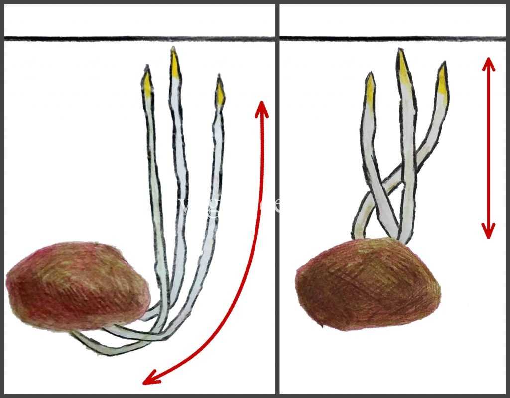 Многие из вас слышали про посадку картофеля ростками вниз, объясняется это тем, что ростки обогнув клубень, пойдут вверх, и белый этиолированный стебель станет длиннее, в отличии от посадки ростками вверх.