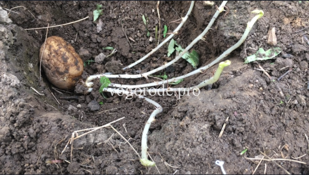 Это, конечно правильно, но это еще не все. Главная причина посадки ростками вниз – это основные корни картофеля. А где они находятся? В месте крепления ростка к клубню!