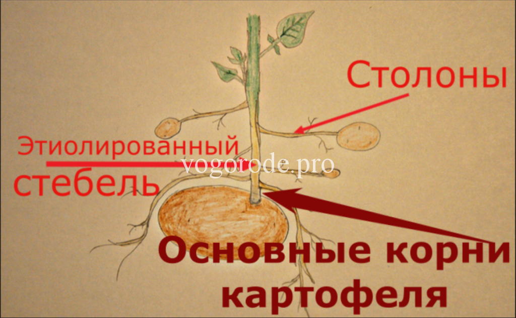 У картофеля есть маленькие корешки на белом этиолированном стебле, маленькие корешки на столонах, и основные корни.