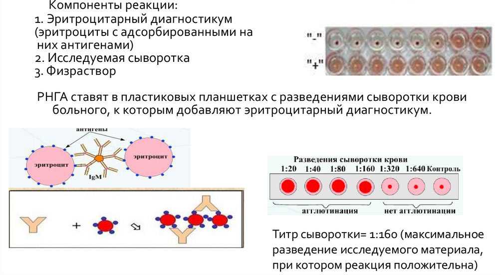 Для проведения исследования используются красные клетки крови – эритроциты, на поверхности которых расположены антигены или антитела. Сыворотка носит название антигенного или антительного эритроцитарного диагностикума. Диагностикум добавляют к исследуемой крови, затем наблюдают за реакцией. При присоединении этих эритроцитов к антигенам или иммуноглобулином крови образуются комплексы, а красные кровяные клетки начинают выпадать в осадок. При отрицательном анализе эритроциты скапливаются в виде небольшого пятна в виде пуговицы. Если же на дне пробирки или планшетки образовался осадок с фестончатыми краями в виде зонтика, то реакция считается положительной.