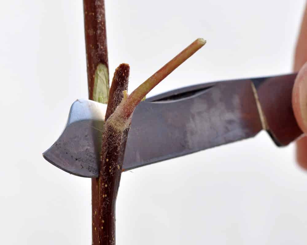 В середине весны или в конце летнего сезона (когда идет активный процесс сокодвижения) размножение можно проводить черенкованием. Обычно в качестве подвоя берут алычу, 3-4-летнюю желтую сливу, разные сорта миндаля, терновник. За несколько дней до операции из отобранного образца аккуратно срезают стебель с сформировавшейся почкой, обрывают листья и заливают водой, чтобы в дальнейшем можно было легко отделить кору.