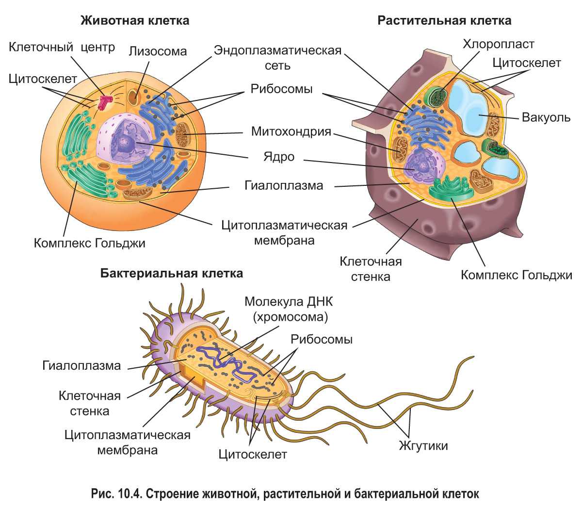 Изображения ниже являются представлениями растение, животные и бактериальные клетки, показывающие общие органеллы.