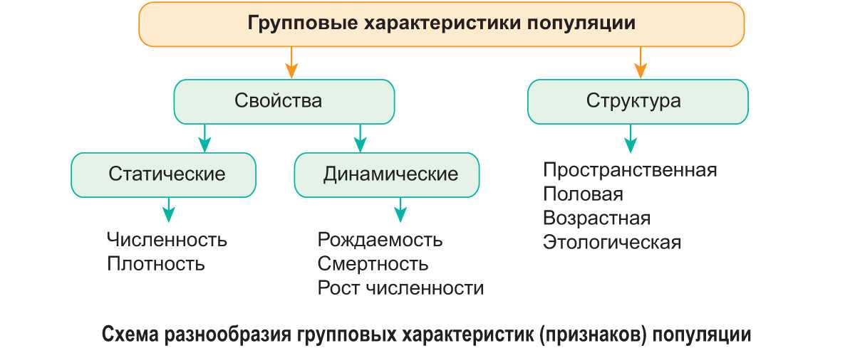 Как видно из схемы, групповые характеристики разделяют на свойства и структуру. Именно их изучение позволяет человеку прогнозировать будущее популяции и правильно с ней взаимодействовать. Свойства популяции по возможности их определения разделяют на статические и динамические. Статические свойства можно определить в любой момент времени. К ним относятся численность и плотность. Для определения динамических свойств требуется интервал времени. К ним относятся рождаемость, смертность и рост численности. Рассмотрим характеристику статических свойств популяции.