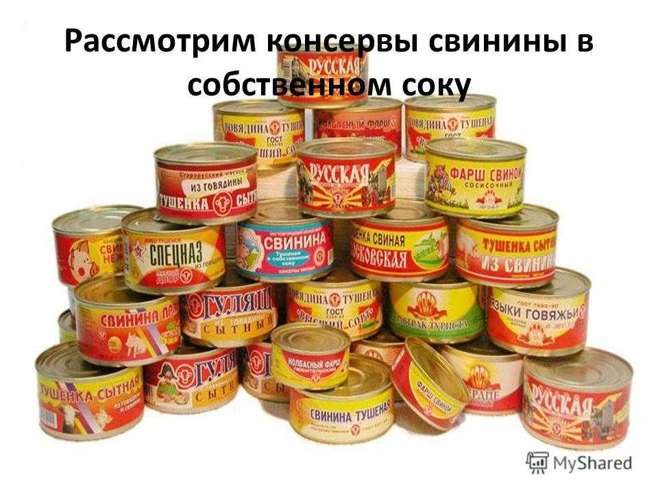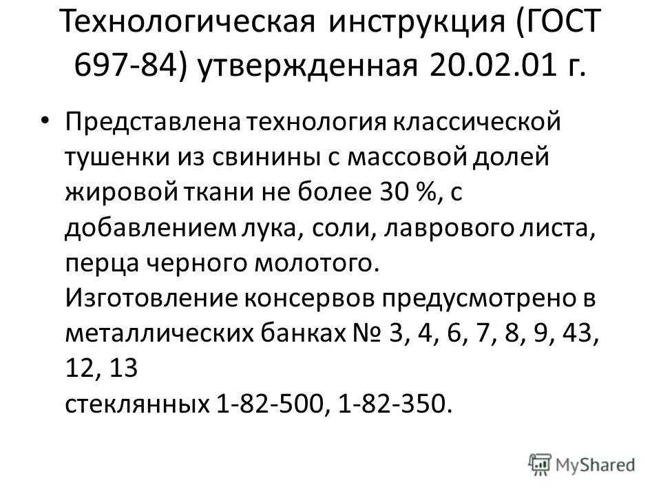 Технологическая инструкция (ГОСТ ) утвержденная г. Представлена технология классической тушенки из свинины с массовой долей жировой ткани не более 30 %, с добавлением лука, соли, лаврового листа, перца черного молотого. Изготовление консервов предусмотрено в металлических банках 3, 4, 6, 7, 8, 9, 43, 12, 13 стеклянных ,